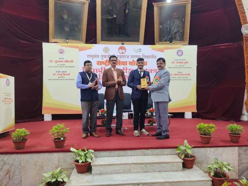 राष्ट्रीय सेवा योजना भंडारा जिल्ह्यातील उत्कृष्ठ स्वयंसेवक म्हणून विद्यापीठाच्या दीक्षांत सभागृहात मा.कुलगुरू आणि मा. प्र -कुलगुरू यांचे हस्ते चंद्रहास खंडारे याचा सत्कार करण्यात आला.